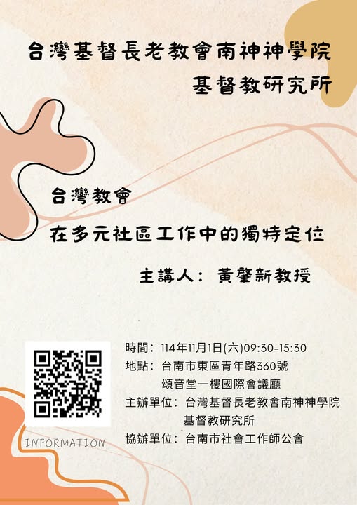 本校基研所社工組即將在2025/11/1(六)舉辦研習活動,主題:台灣教會在多元社區工作中的獨特定位。歡迎報名參加,也敬請代為宣傳及轉貼。