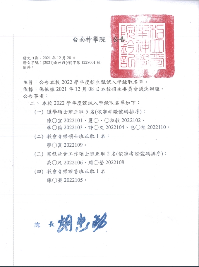 公告本校2022學年度甄試入學錄取名單
